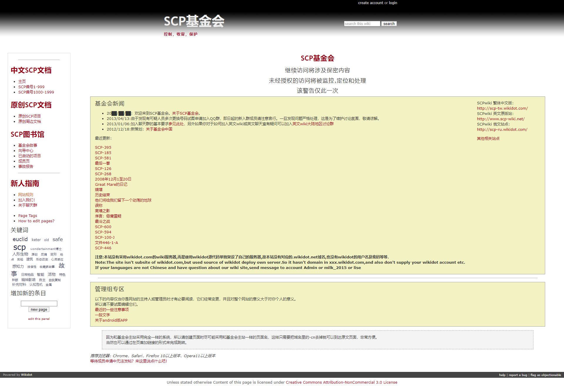 SCP 재단 중국 위키(SCP基金会). CC-BY-SA 라이선스가 아니라 CC-BY-NC를 사용하고있었다.